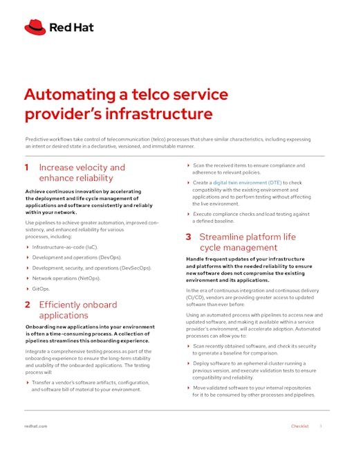 ITAutomating a Telco Service Provider’s Infrastructure Bhavani1 year ago1 year ago01 mins Automating a Telco Service Provider's Infrastructure Read this checklist to see how Red Hat OpenShift Pipelines can help automate a telco service provider’s infrastructure. Download today. FILL THE FORM BELOW First Name * Last Name * Email * Phone Number * Company Name * Address * City * Postal Code * Country * United StatesCanadaUnited KingdomAustraliaIndiaGermanyFranceOther Company Size* 1 to 99100 to 9991000 to 50005000 to 999910000+ Job Title* Industry * Red Hat may use your personal data to inform you about its products, services, and events. Notify me about products, services, and events.Unsubscribe me from all marketing communications about Red Hat products, services, and events, including event invitations. You can stop receiving marketing emails by clicking the unsubscribe in each email or withdraw your consent at any time in the Preference Center. See Privacy Statement.for details. Download Now Post navigation Previous: Simplify IT Infrastructure With AutomationNext: AI governance for responsible transparent and explainable AI workflows