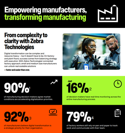 Digital transformation can be complex and resource-heavy – but it doesn’t have to be. On factory and plant floors, success comes from balancing strategy with execution. With Zebra Technologies’ connected factory approach, small and medium size manufacturers can unlock real scalable solutions – faster and easier than ever.