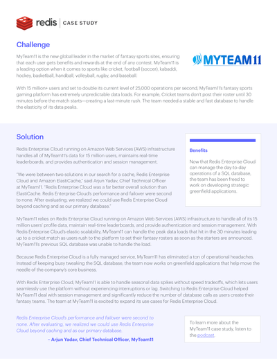 With 15 million+ users and set to double its current level of 25,000 operations per second, MyTeam11’s fantasy sports gaming platform has extremely unpredictable data loads. For example, Cricket teams don’t post their roster until 30 minutes before the match starts—creating a last-minute rush. The team needed a stable and fast database to handle the elasticity of its data peaks.